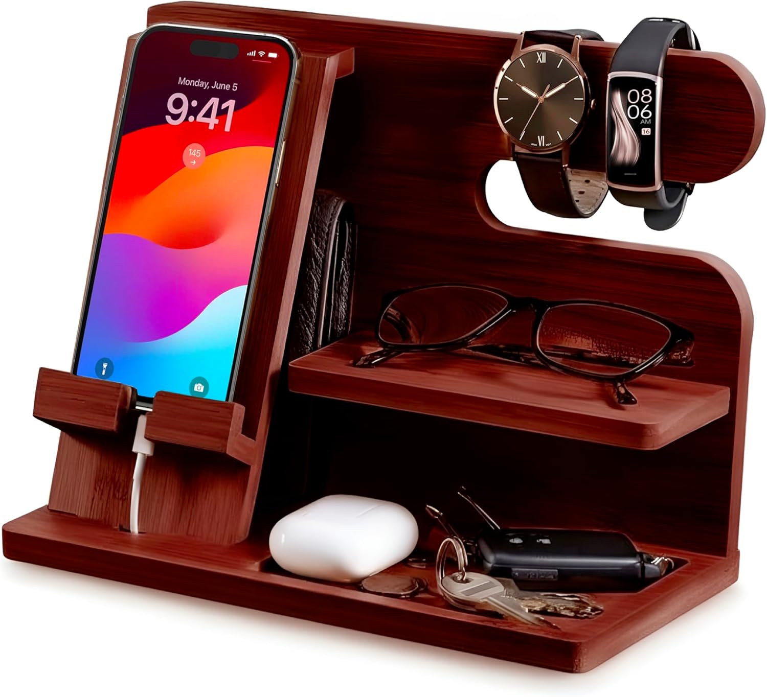 Organized Nightstand Setup: Designed as a nightstand organizer, providing dedicated space for daily essentials to keep bedside surfaces tidy. Built for Men’s Daily Use: This nightstand organizer for men supports storage for watches, wallets, phones, and accessories in one accessible spot.
